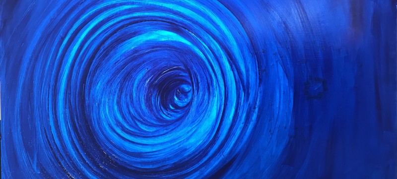 Afgelopen dinsdag, toen ik mijn kwast opnam, hoorde ik een gids in mijn hoofd; ‘begin met blauw.’ Dus koos ik cyan-kleuhrige olieverf en vulde het schilderbord. Terwijl ik bezig was begon mijnhand, zoals ik ook vaak meemaakte in healing, vanzelf te bewegen en trok steeds kleiner wordende cirkels. Vervolgens hoorde ik: ‘neem nu paars.’ Dus mengde ik magenta door het cyaan en volgde de cirkels de tegengestelde richting op. Toen ik een stap naar achteren deed, kreeg ik kippenvel. Ik herkende een drakenoog aan het einde van een wormgat.
